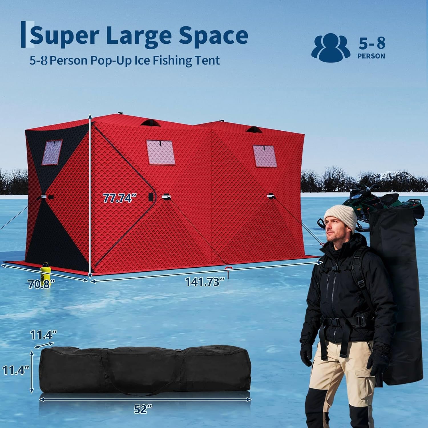 Pop Up Ice Fishing Tent Insulated Ice Fishing Shelter with 49Ft LED Light Strip,3-Layer Insulated Shelter for 3-8 Person, Portable Waterproof Oxford Ice Shanty with 2 Doors/Anchors/Ropes/Carrying
